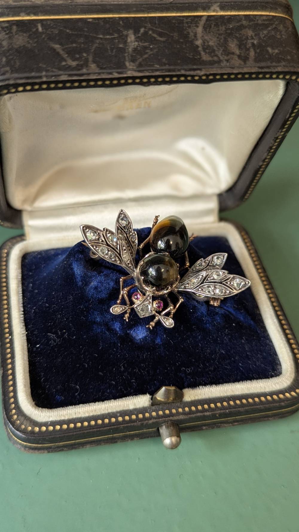 Le corps de l’insecte est constitué d’un cabochon de quartz œil de tigre, dont les nuances brunes et dorées structurent la composition. Les ailes sont serties de diamants taillés à la rose, selon une technique largement utilisée au XIXe siècle, tandis que quelques pierres rouges ponctuent l’ensemble, introduisant un contraste discret.