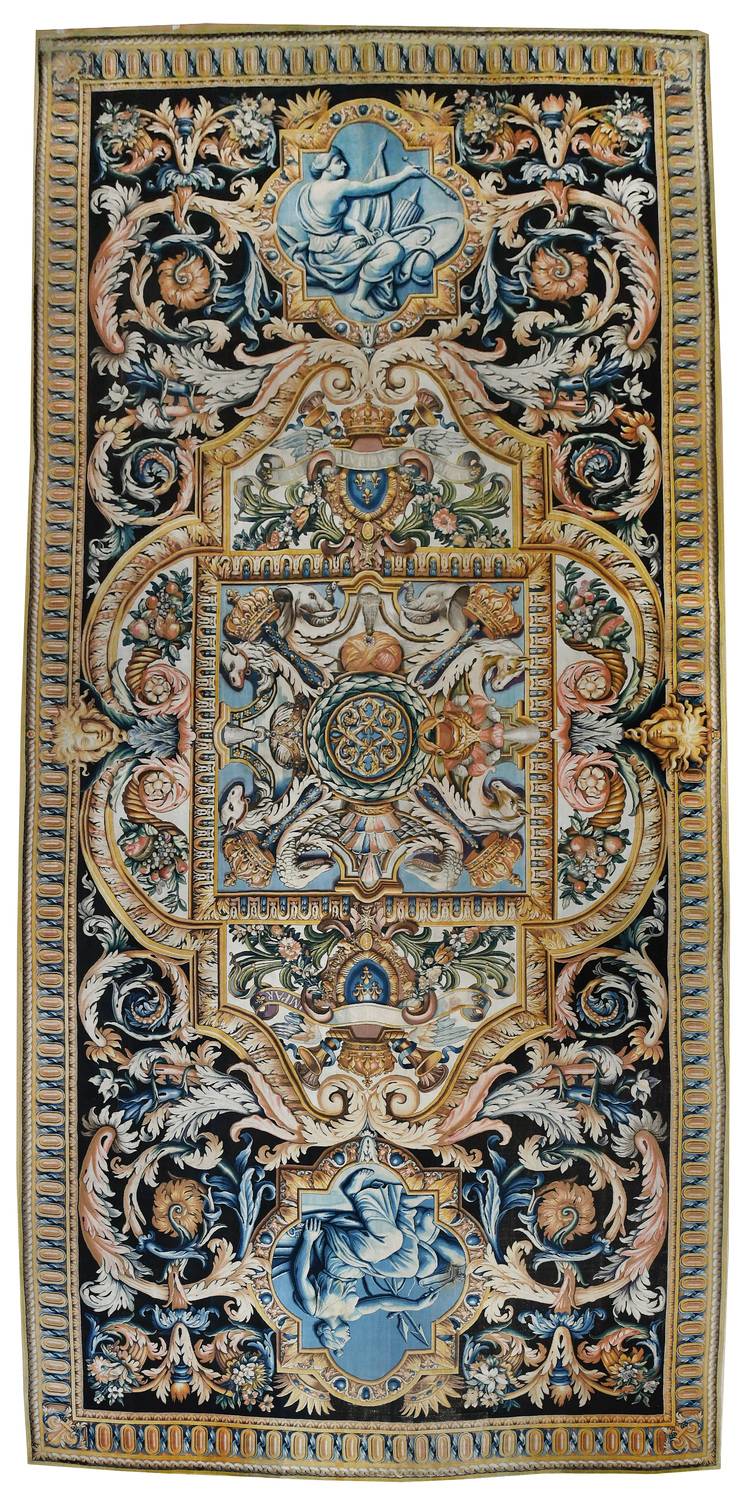 Louis XIV fait exécuter, entre 1668 et 1688, un ensemble monumental de tapis de Savonnerie destinés à couvrir le sol de la Grande Galerie reliant le Louvre aux Tuileries, soit près de 92 tapis pour environ 4 000 m² de surface tissée. La commande, pilotée par Colbert, répond à un double enjeu : affirmer le faste de la monarchie française et rivaliser avec les grands décors princiers européens en transformant le Louvre en résidence officielle du roi. Les modèles sont confiés à Charles Le Brun, premier peintre du roi, qui conçoit un programme décoratif d’une inventivité exceptionnelle, mêlant emblèmes royaux, allégories et grandes figures mythologiques. Tissés à la manufacture de la Savonnerie, ces tapis représentent l’une des entreprises textiles les plus ambitieuses du règne, par l’échelle comme par la qualité technique. Après la mort de Colbert et le déplacement de la cour vers Versailles, l’ensemble n’est finalement jamais déployé au Louvre ; dispersions, découpes et ventes révolutionnaires entraînent la perte de nombreux éléments. Sous le Premier Empire et la Restauration, puis au XXe siècle, l’État et le Mobilier national entreprennent de racheter et réunir les pièces encore repérables, opération poursuivie récemment avec l’acquisition de fragments majeurs.